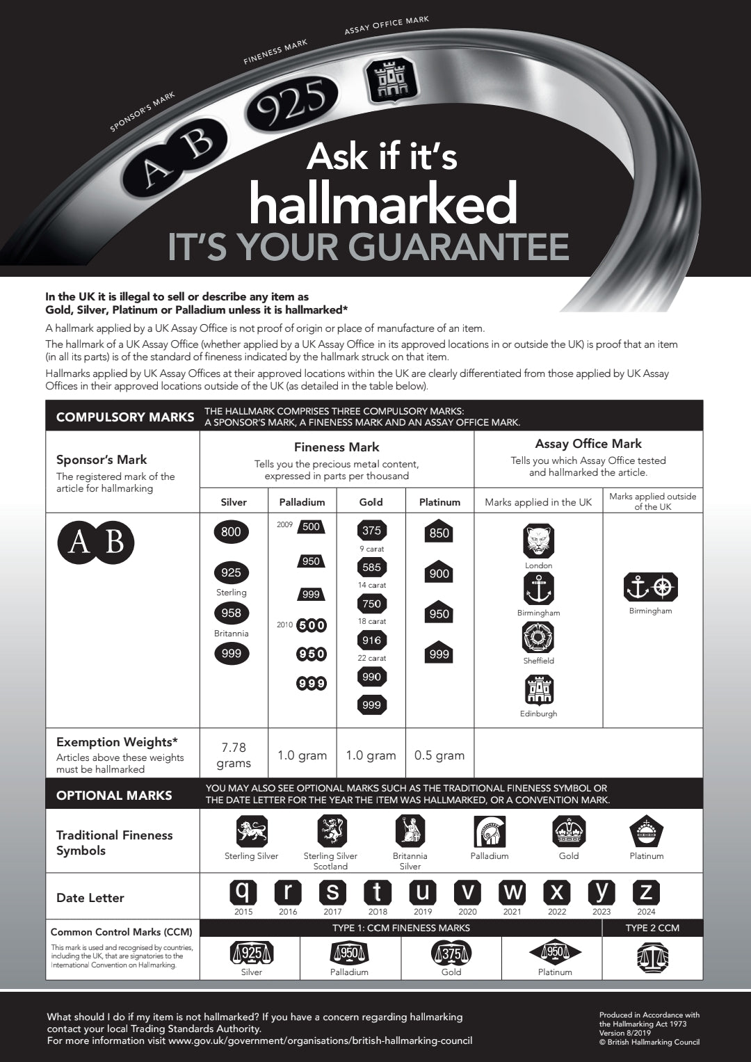 A hallmark is a guarantee that your jewellery has been tested and meets the legal UK requirements for precious metals.