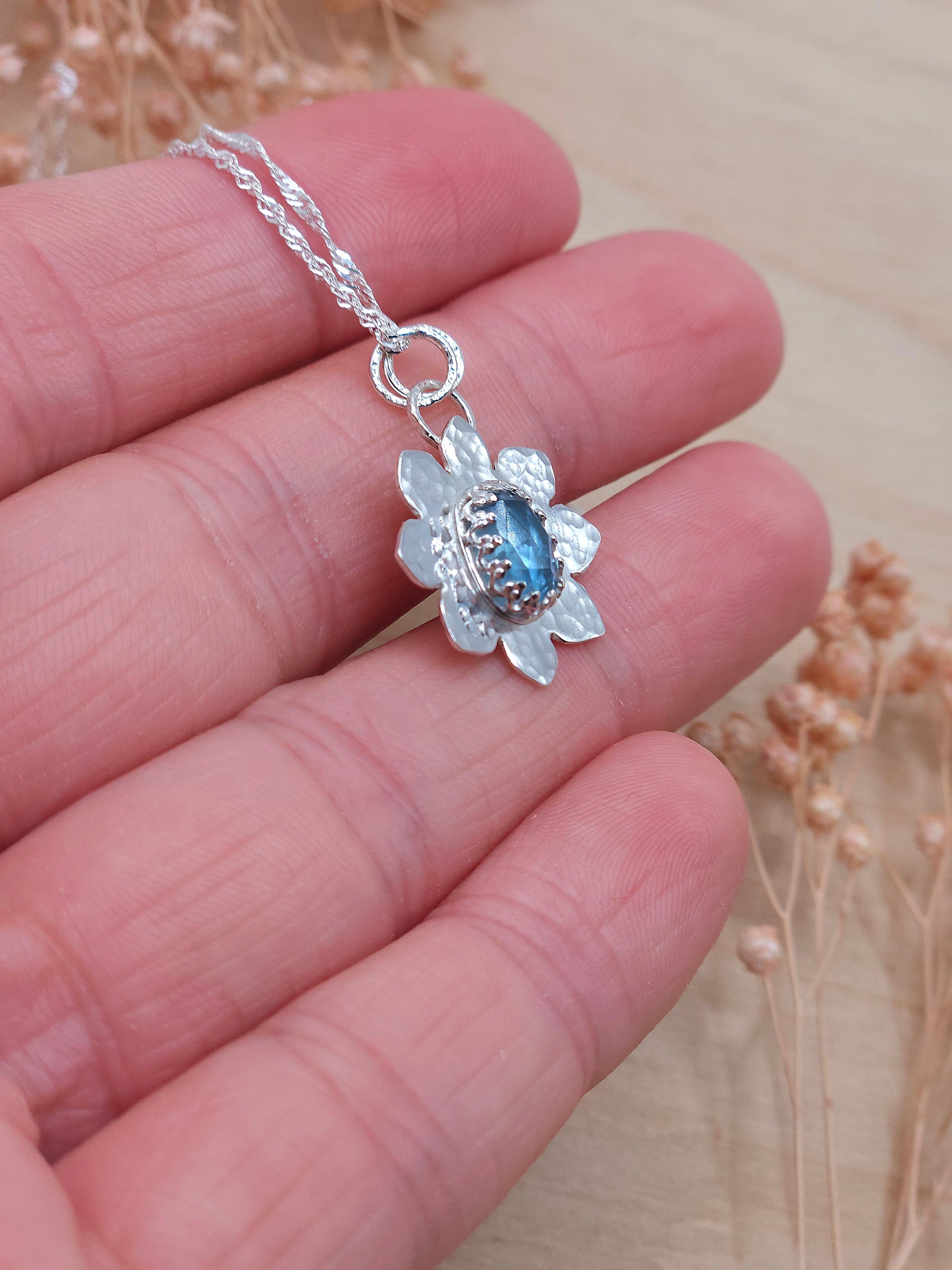 A dainty hammered flower necklace with an Aquamarine gemstone! The perfect floral piece for a March birthstone gift.