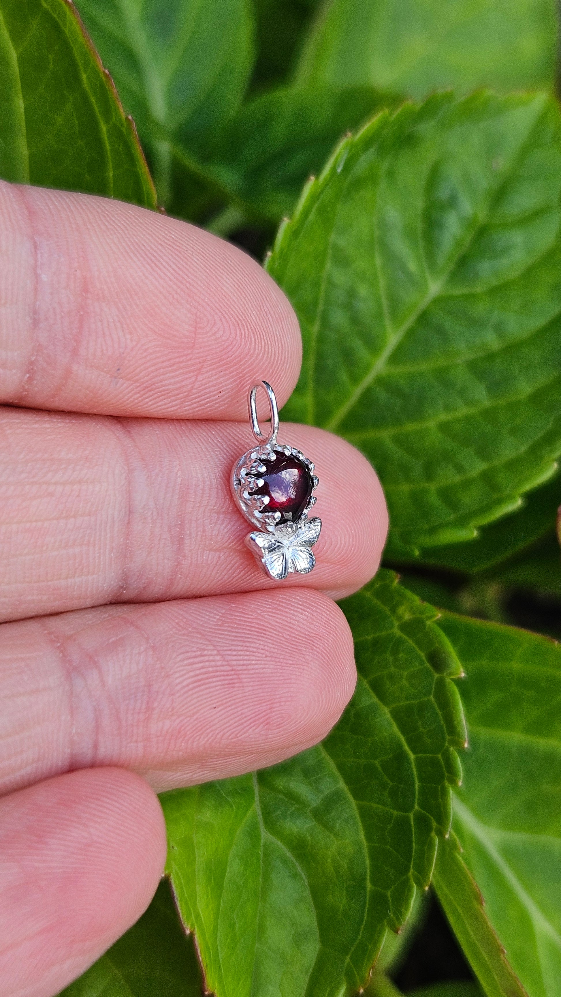 A dainty butterfly pendant featuring a natural Rhodolite Garnet gemstone. Part of the Butterfly Gem collection. This would be the perfect gift for anyone who needs a little bit of magic in their life.
