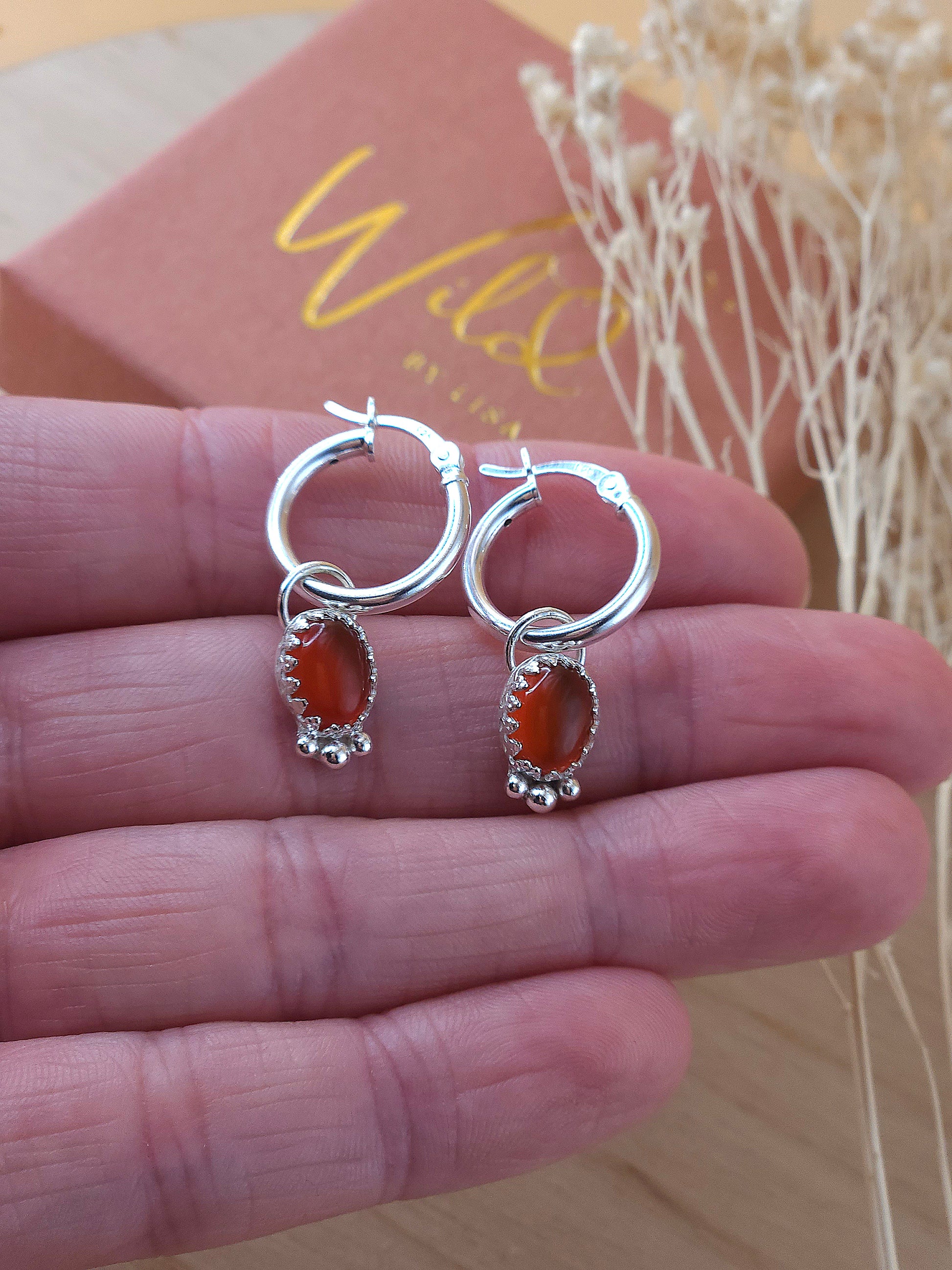 A lovely pair of silver mini hoops with a Carnelian charm. Perfect for any occasion; pair with a casual outfit for a little bit of sparkle or with a gorgeous dress for an evening out.