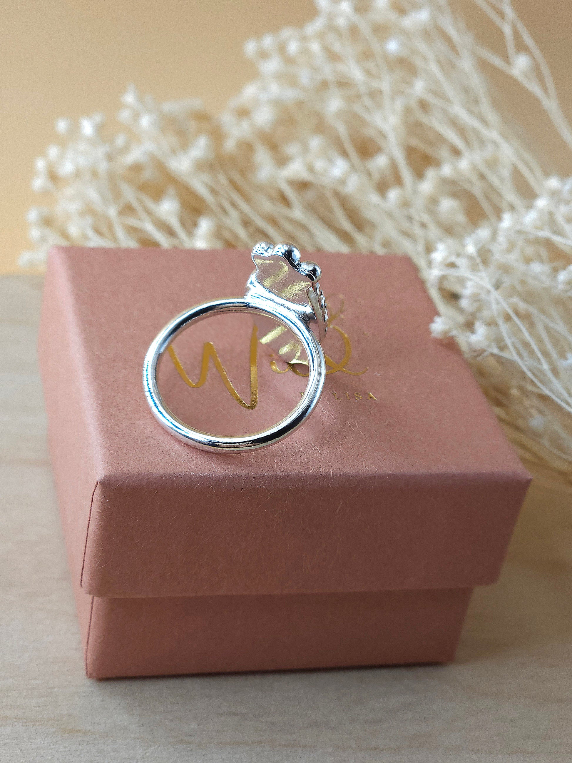 A silver ring featuring a glowy Carnelian gemstone with silver granulation embellishments.