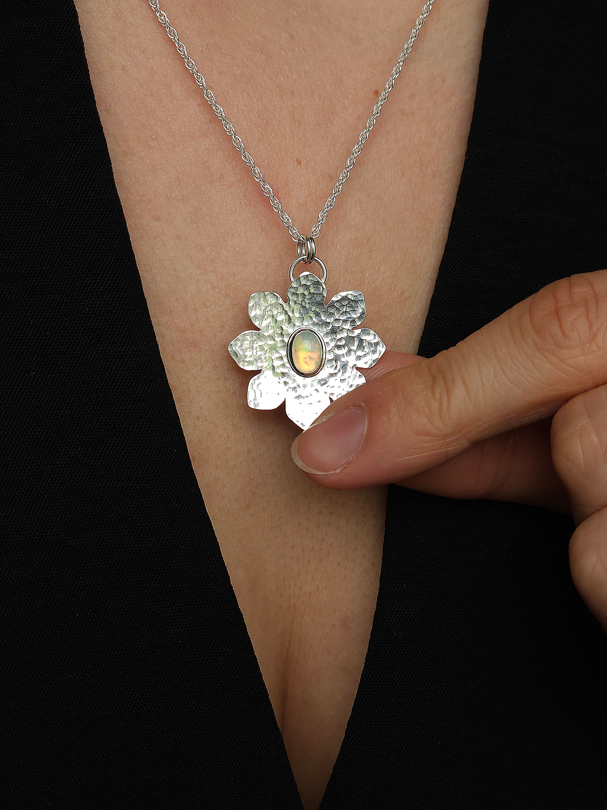 A hammered flower pendant featuring a gorgeous Ethiopian Opal gemstone. Ethiopian Opals display the most amazing colours when viewed in the light making this a truly unique piece. It would make the best birthstone gift for anyone with an October birthday!