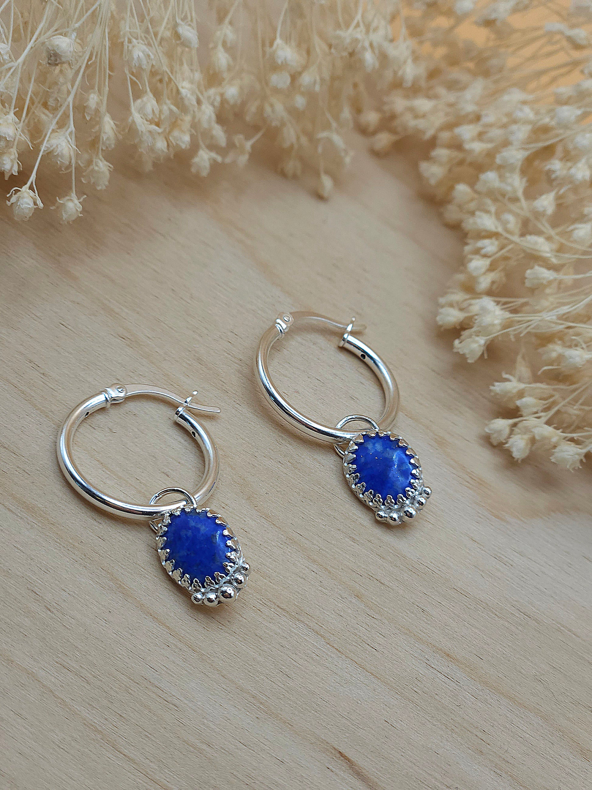 A lovely pair of small silver hoops with a Lapis Lazuli charm. Perfect for any occasion; pair with a casual outfit for a little bit of sparkle or with a gorgeous dress for an evening out. The perfect birthstone gift for a September birthday.