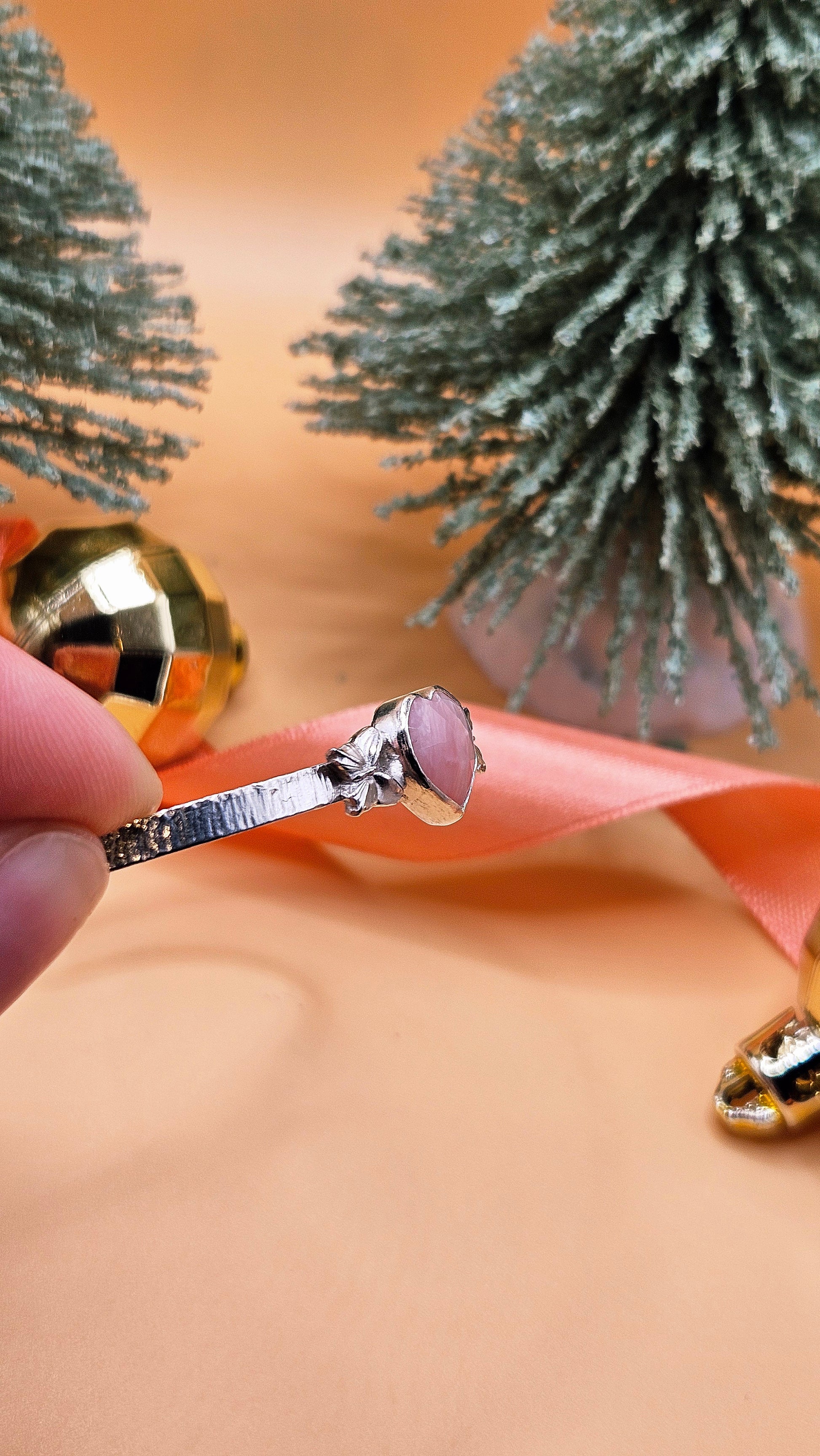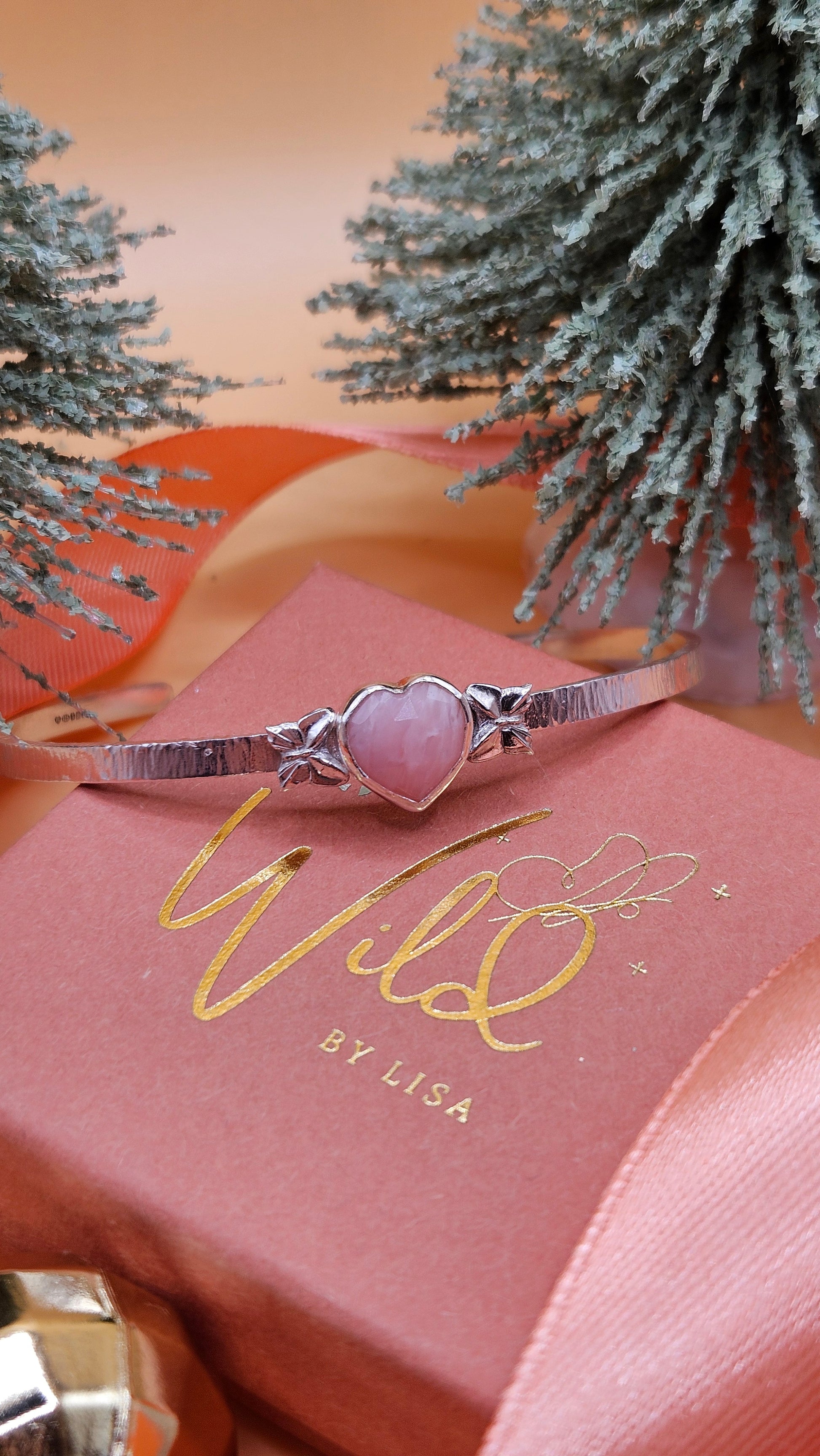 Silver butterfly bangle with a heart-shaped Pink Opal gemstone.