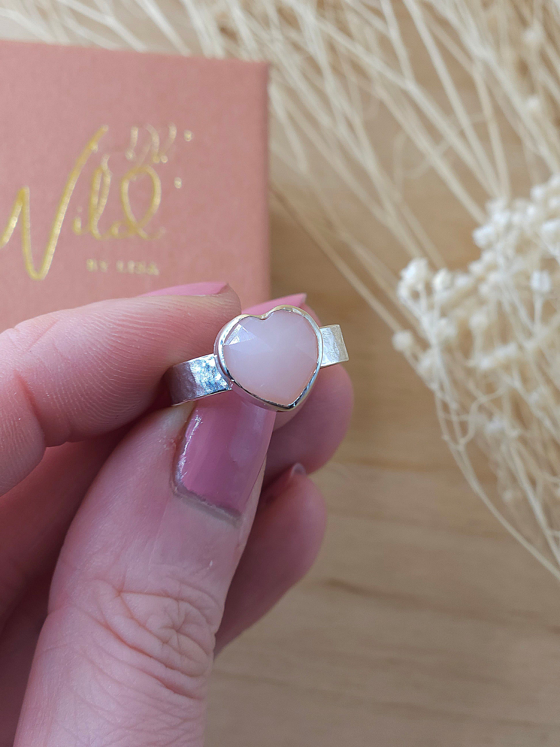A Pink Opal heart ring with a lightly hammered band. The perfect gift to say 'I love you' to yourself or a loved one!