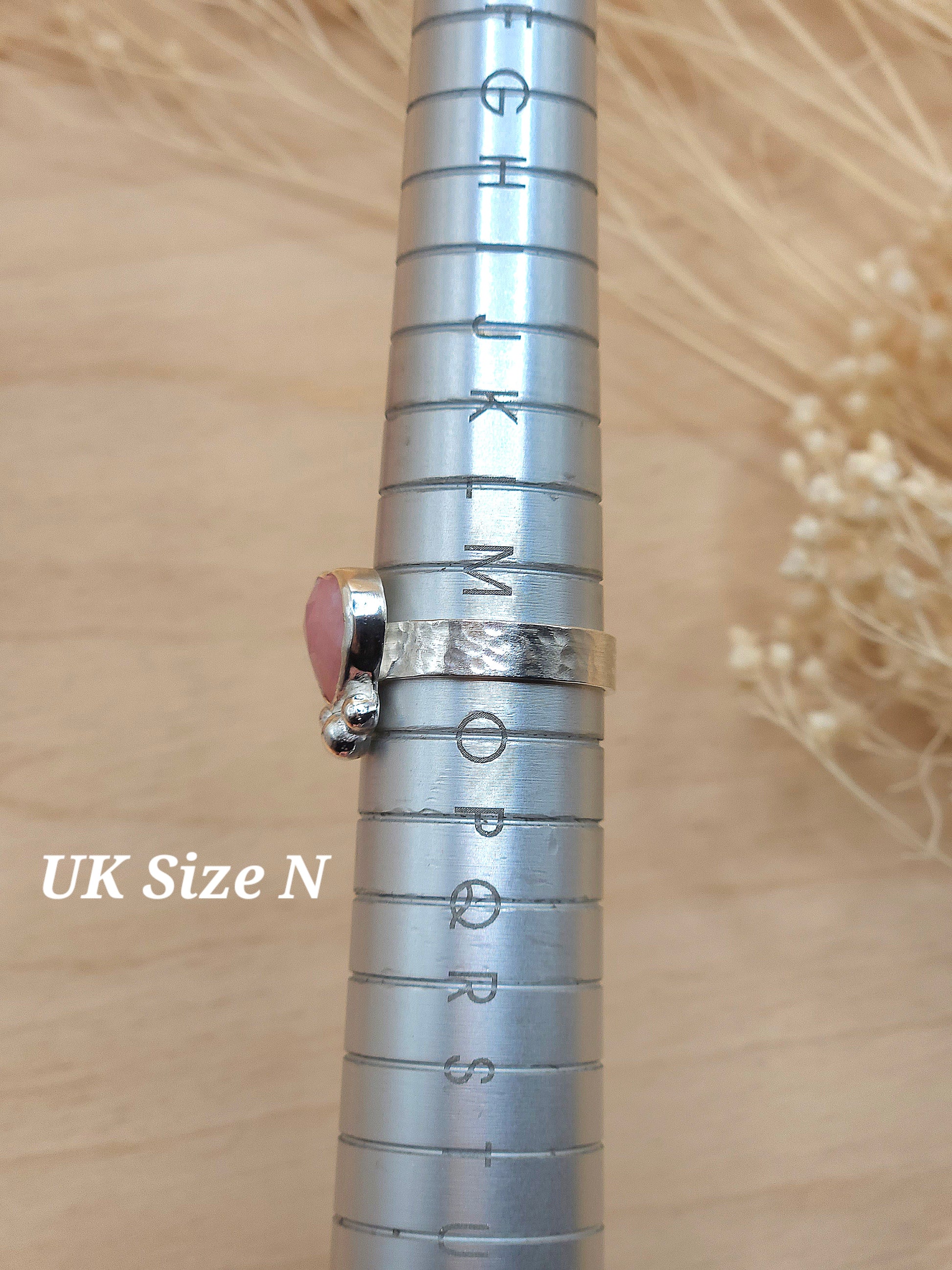 A Pink Opal heart ring with silver granulation embellishments and a lightly hammered band. The perfect gift to say 'I love you' to yourself or a loved one!