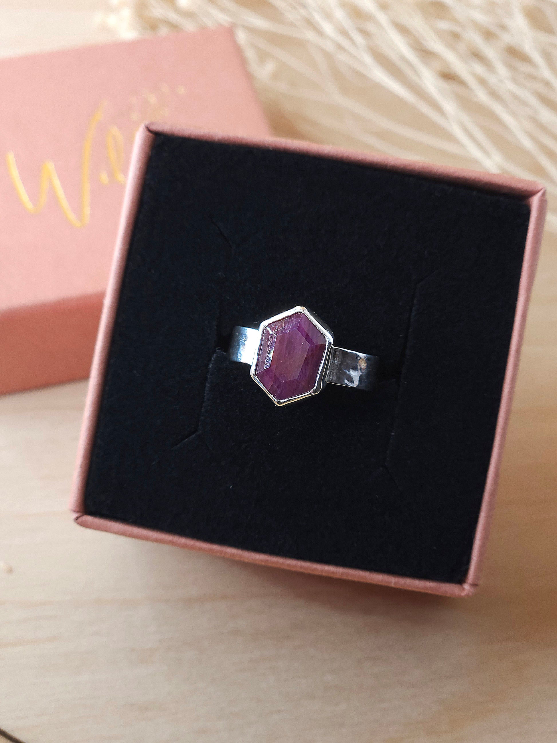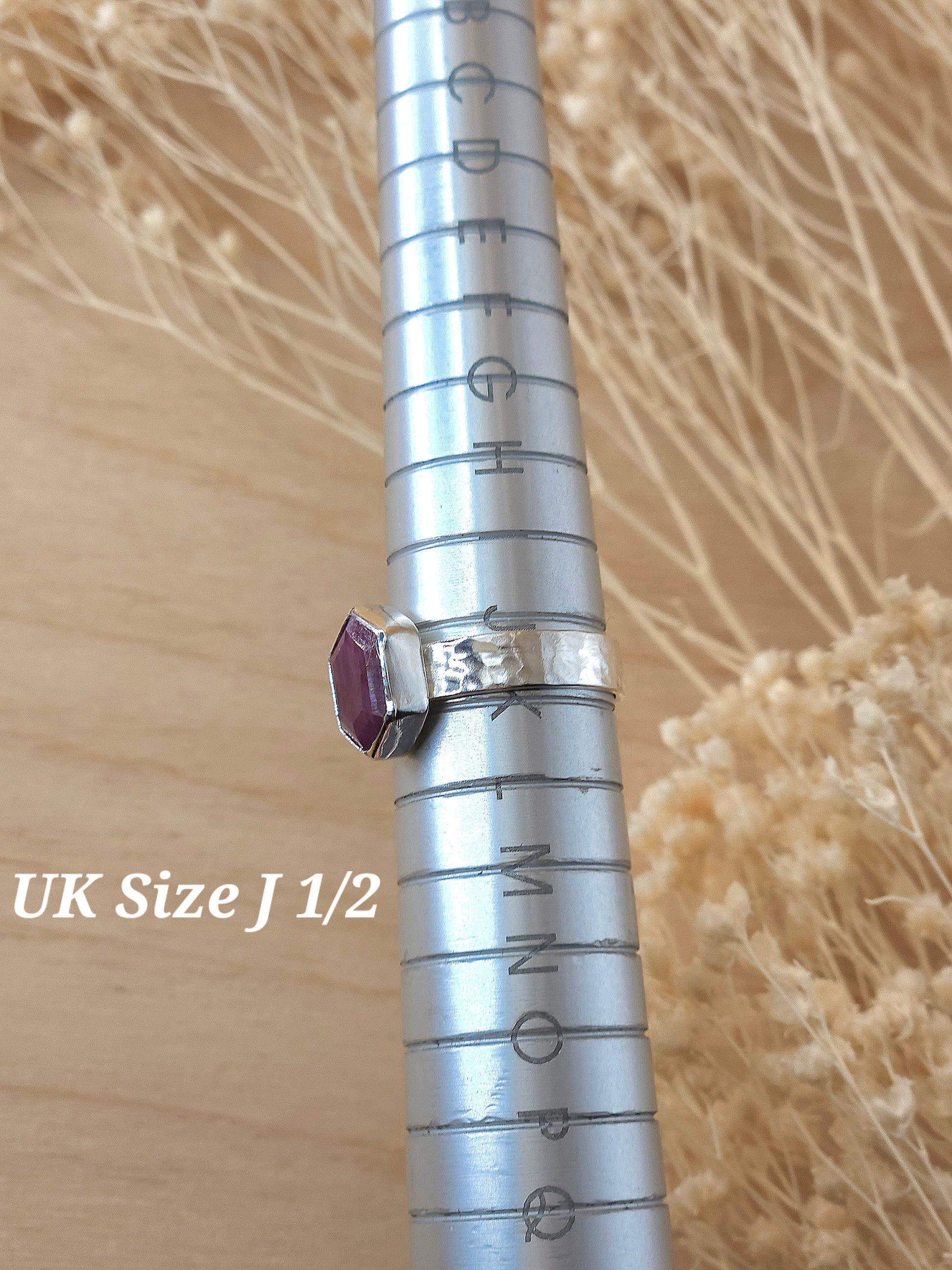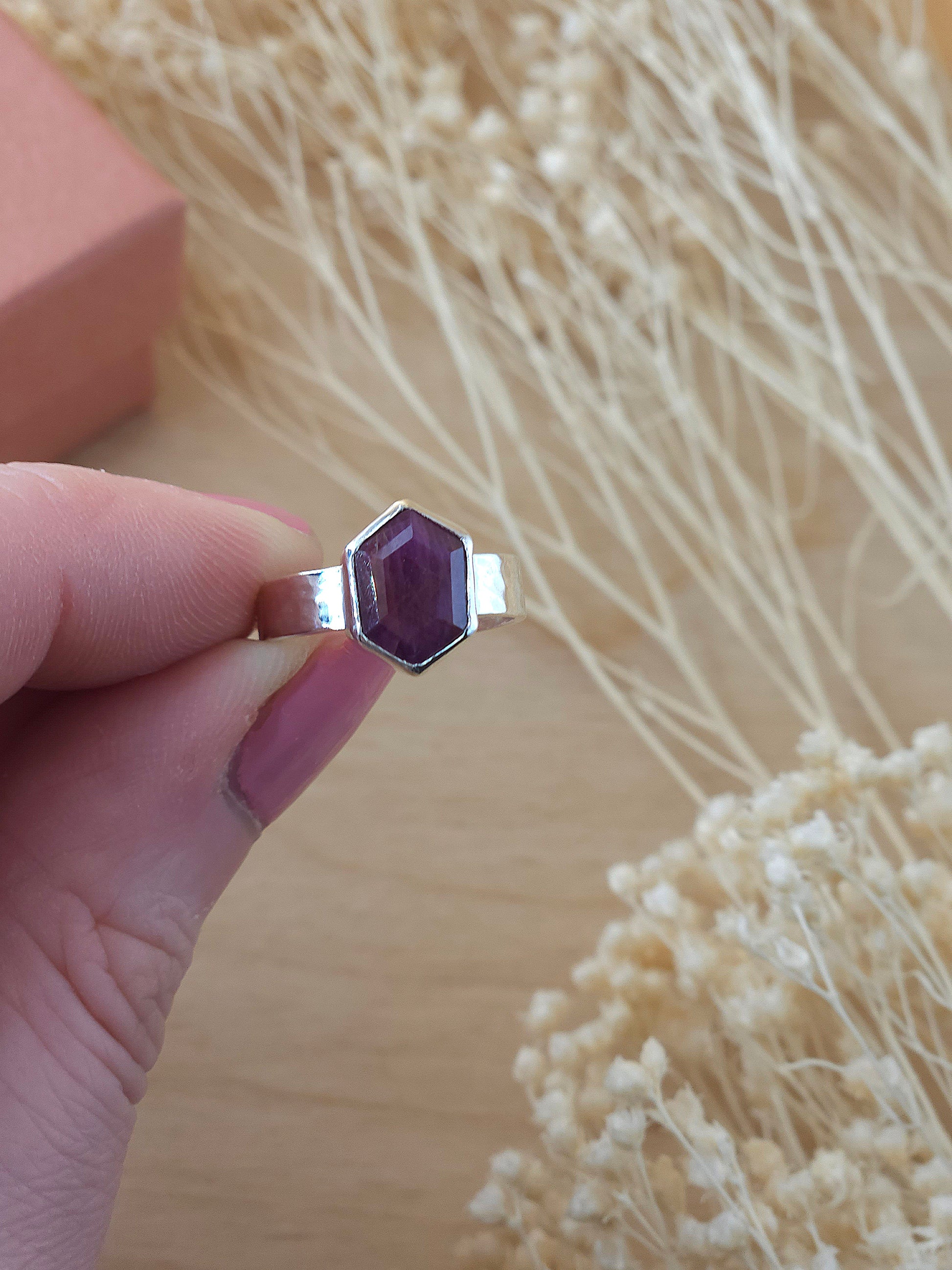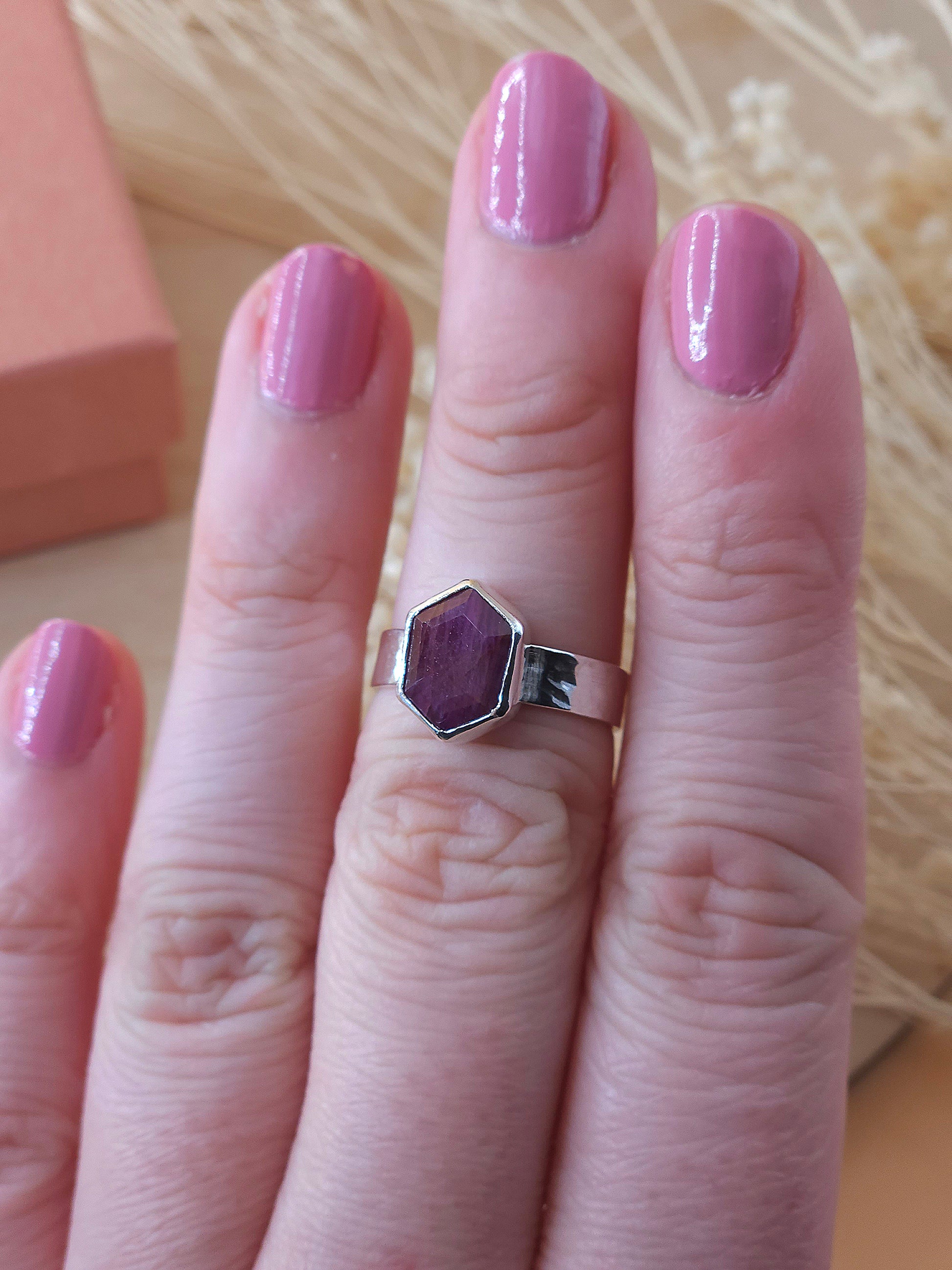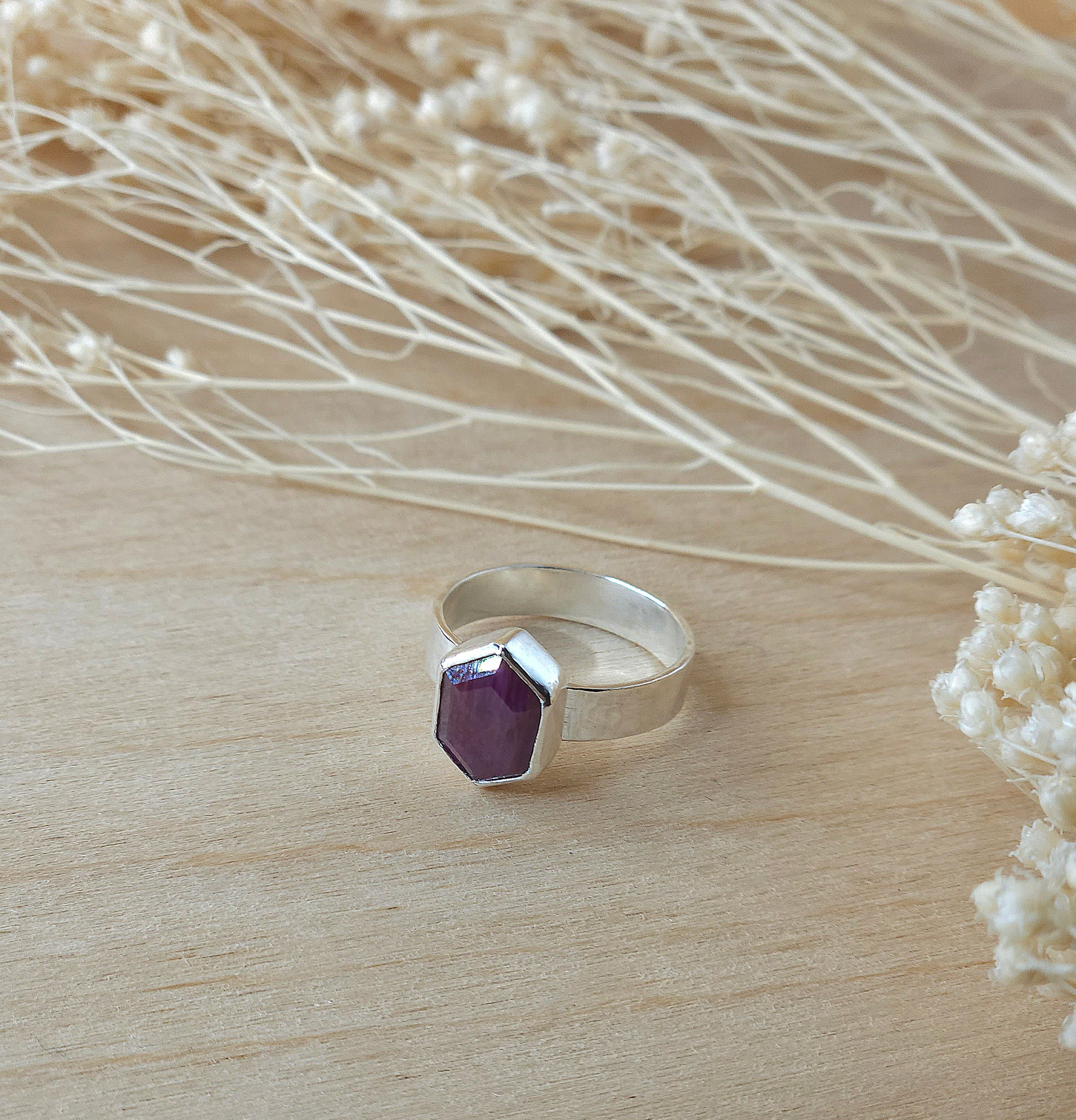 A hexagonal Ruby ring with a lightly hammered band. Perfect for a pinky ring or for anyone with dainty fingers! Ruby is also the birthstone for July and would make a lovely gift.